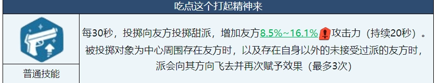 小夏的基础技能是朝离自己最近的队友扔出馅饼,能让队友攻击力提升8.5%到16.1%。要是首次抛出的馅饼成功命中队友,这馅饼就会从该队友身上弹射到其他队友那里,最多能弹射三次。说白了,这就是个给队友加攻击力的技能,效果持续20秒。