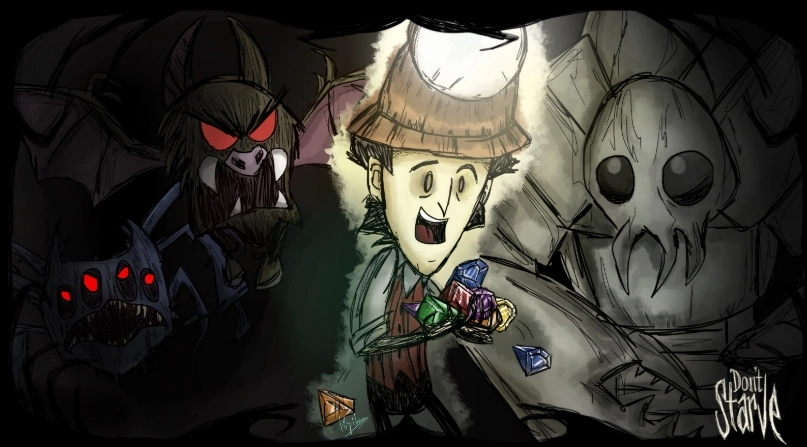 对于刚接触饥荒的新手玩家而言,首先要面对的挑战就是黑夜。游戏中的时间划分为白天、黄昏与夜晚三个阶段,要是角色在黑夜中没有任何光源,就会遭到黑夜的攻击(也就是玩家常说的“查理摸你”,关于查理的具体身份,大家可以去了解饥荒的背景故事)。一般在黑夜中待上大约五秒,角色就会被攻击一次,每次攻击会造成100点伤害,很多萌新的第一次死亡都是因为黑夜。解决这个问题其实很简单,开局时先收集草和树枝这些基础资源,首要目标是凑齐制作火把的材料。